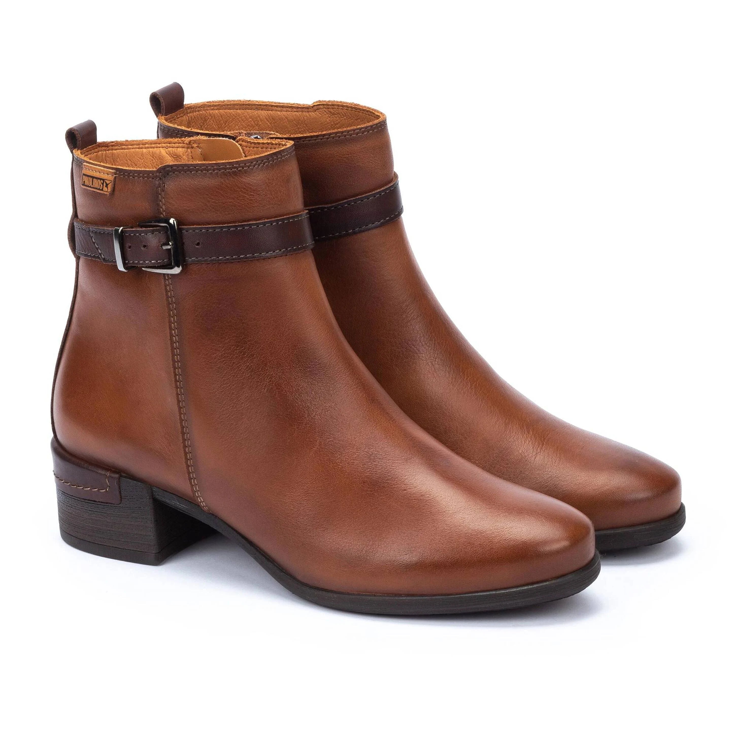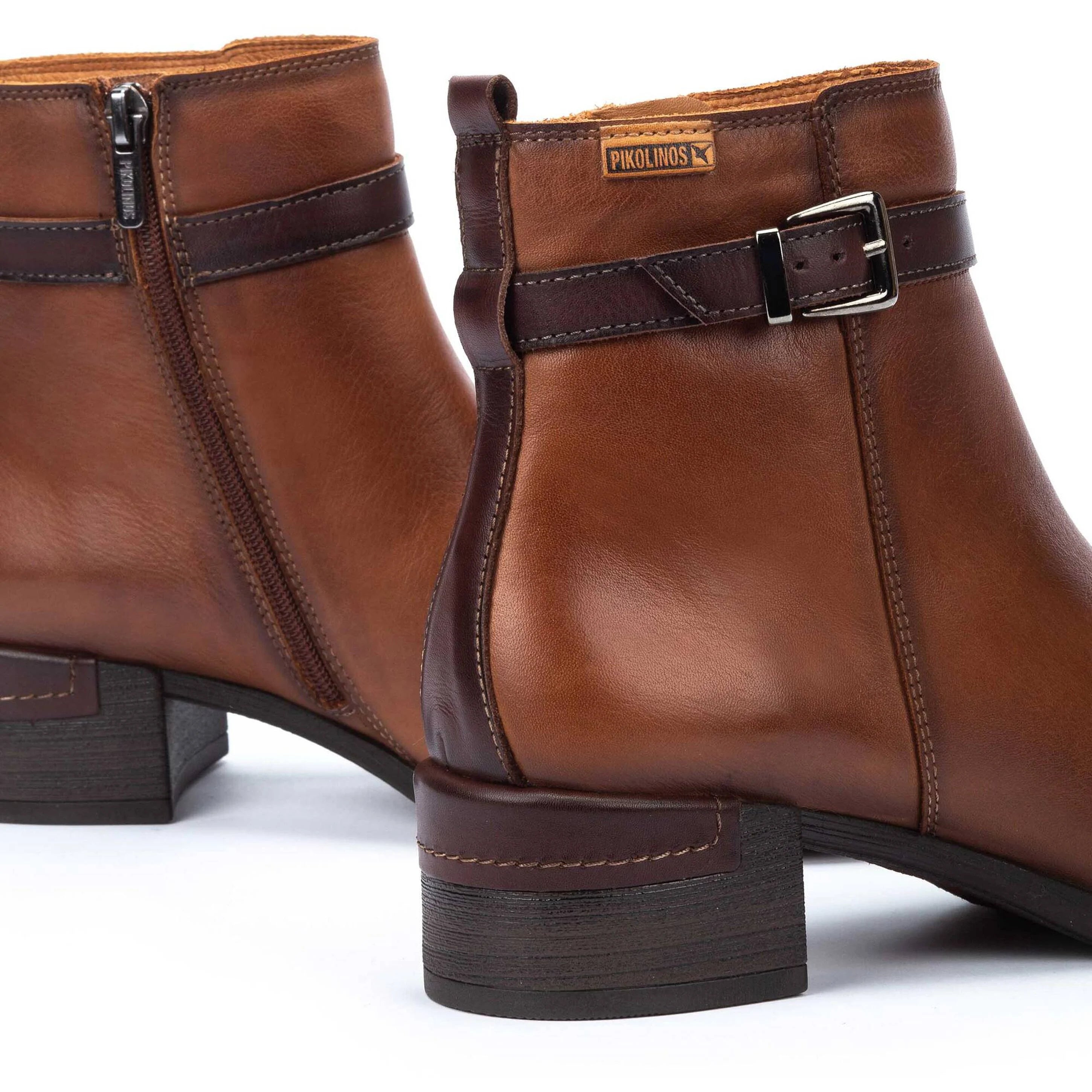 Botín de tacón de la marca PIKOLINOS, modelo MÁLAGA W6W-8622C1. Exterior en PIEL color cuero.