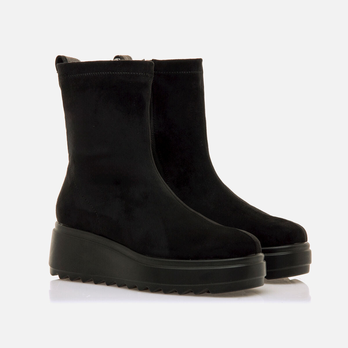 Su diseño liso tipo stretch se combina con una plataforma gruesa dentada que aporta comodidad y un look actual. Incluye cremallera interior para facilitar el calce y tirador trasero funcional. Ideal para quienes buscan un botín versátil con un toque moderno que se ajusta a tu figura. Fabricado con un 60% de algodón reciclado post consumo y un 40% de algodón convencional.