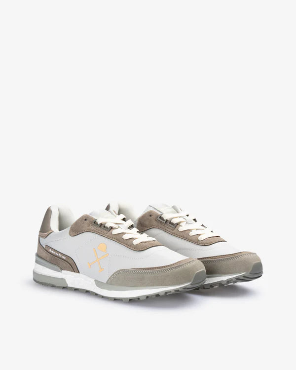 Sneaker de inspiración retro running, confeccionada en serraje combinado con nylon técnico. Cuenta con logo lateral bordado, cierre de cordones y refuerzos en puntera y talón. La suela dentada de goma aporta ligereza y gran tracción en el día a día.