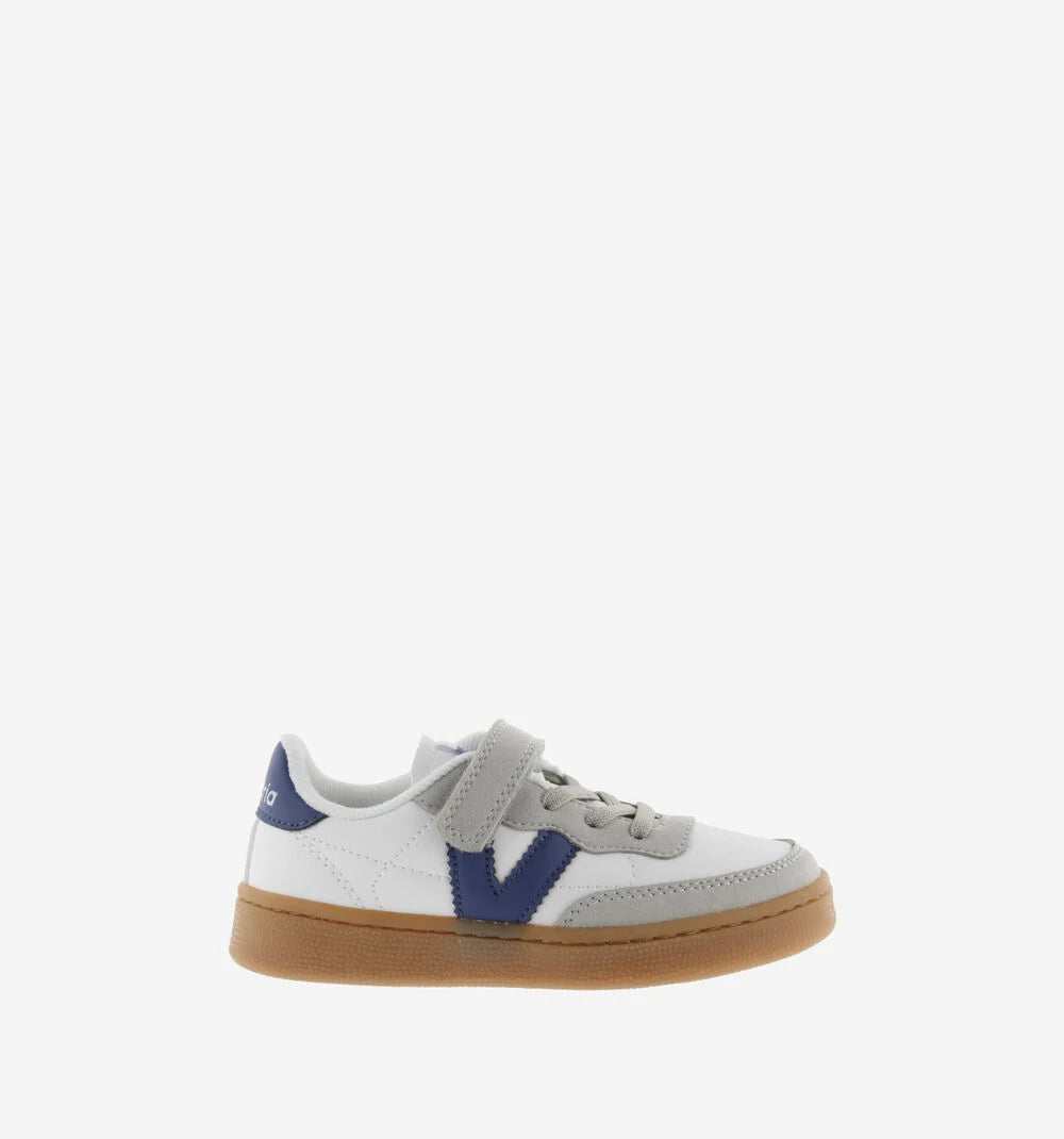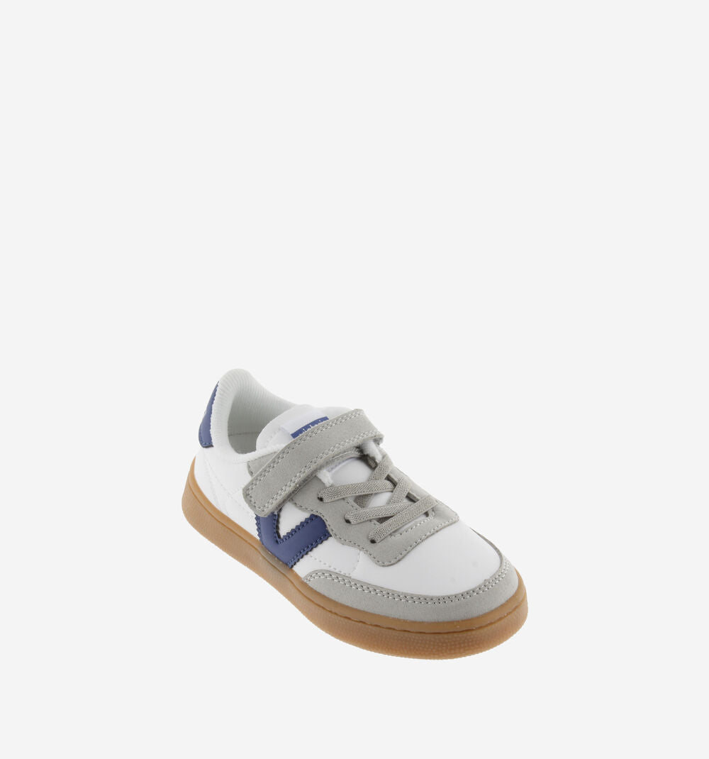 Zapatillas deportivas para niños fabricadas en efecto piel blanca y piezas de efecto serraje. Detalle de color en la V de victoria lateral, a juego con la pieza trasera, que presenta el logotipo de la marca grabado en blanco. Cierre mediante cordón elástico, que se acompaña de una tira adherente para facilitar el calce y aportar sujección, fomentando su autonomía. Cómoda suela de TPR en color caramelo.