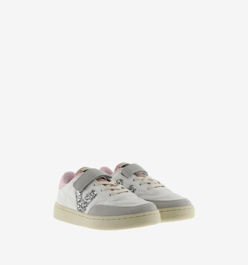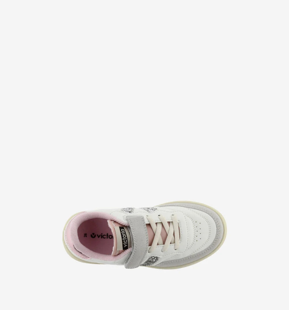 Zapatillas deportivas para niña fabricadas en efecto piel blanca con piezas fantasía y de efecto serraje. V de victoria lateral en glitter, y pieza trasera metalizada en rosa, a juego con el forro interior. Presenta también el logotipo de la marca grabado en blanco. Cierre mediante cordón elástico, que se acompaña de una tira adherente para facilitar el calce y aportar sujección, fomentando su autonomía. Cómoda suela de TPR ligeramente tostada.