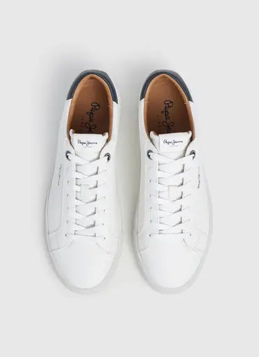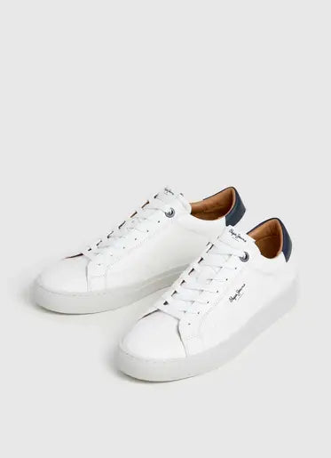 Zapatillas clásicas en efecto piel. Cierre de cordones. Ojal metálico personalizado con logo grabado. Logo PEPEJEANS termosellado en laterales. Etiqueta con logo en lengüeta. Plantilla termoformada y extraíble. Cuello acolchado. Talón en contraste de colores. Suela cupsole de caucho.
