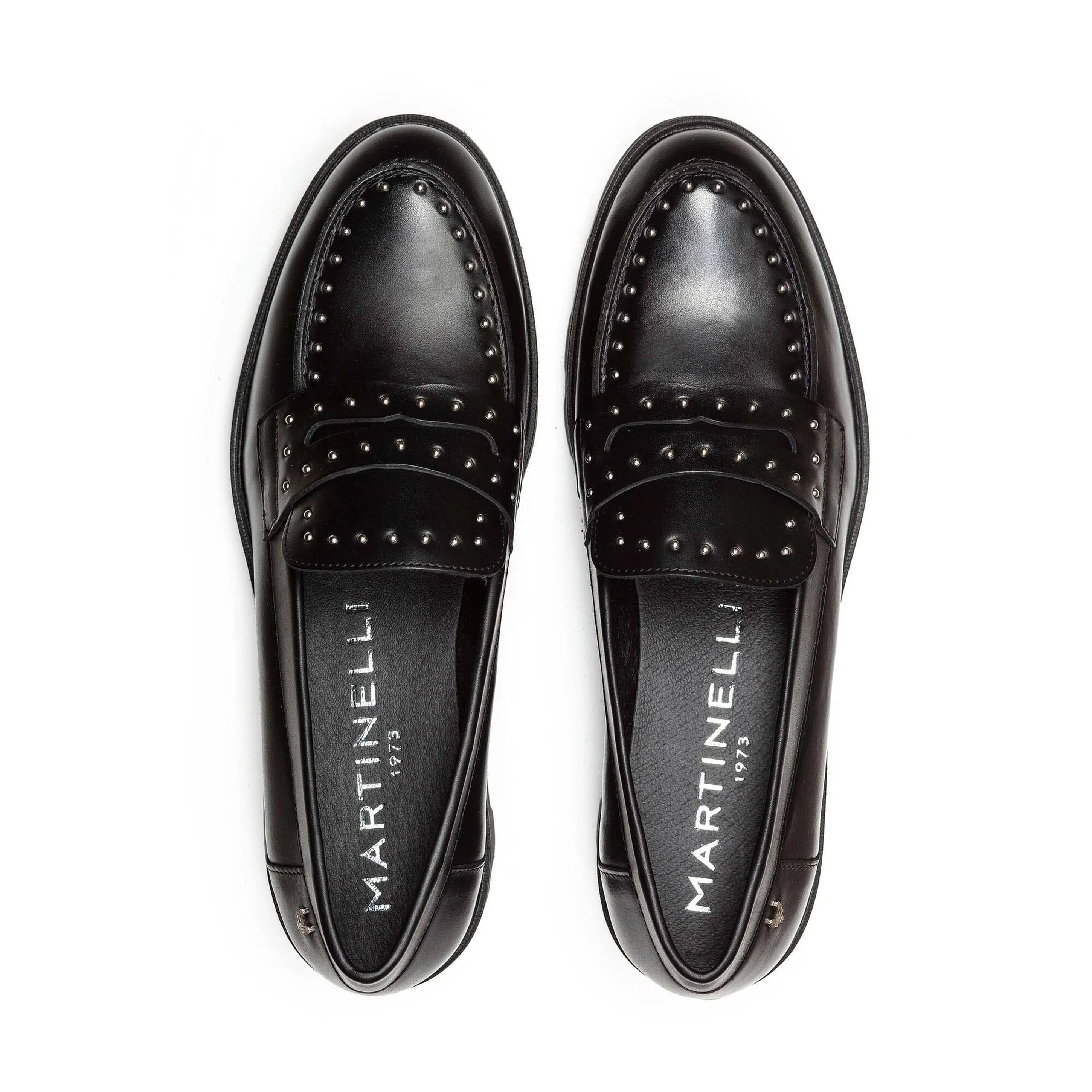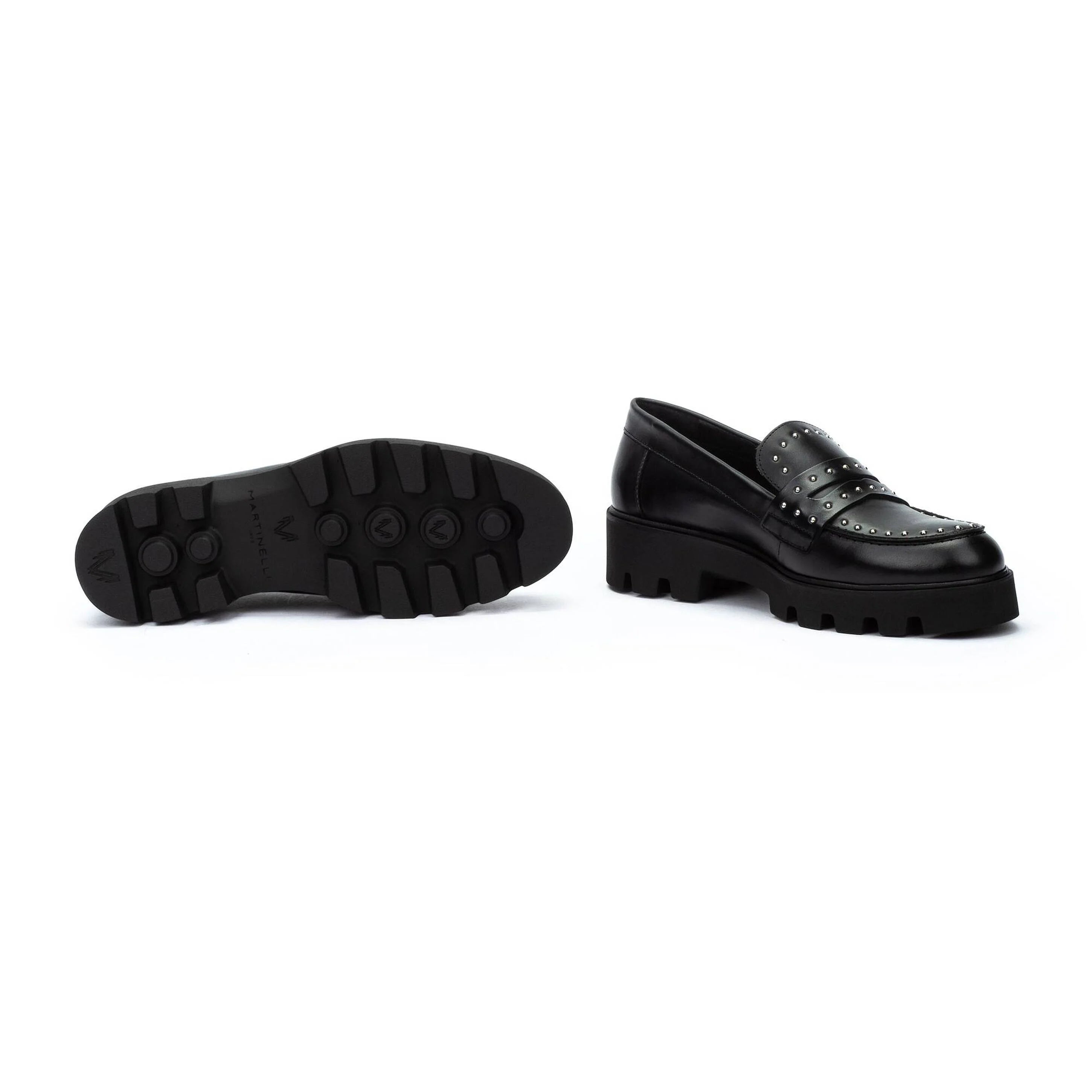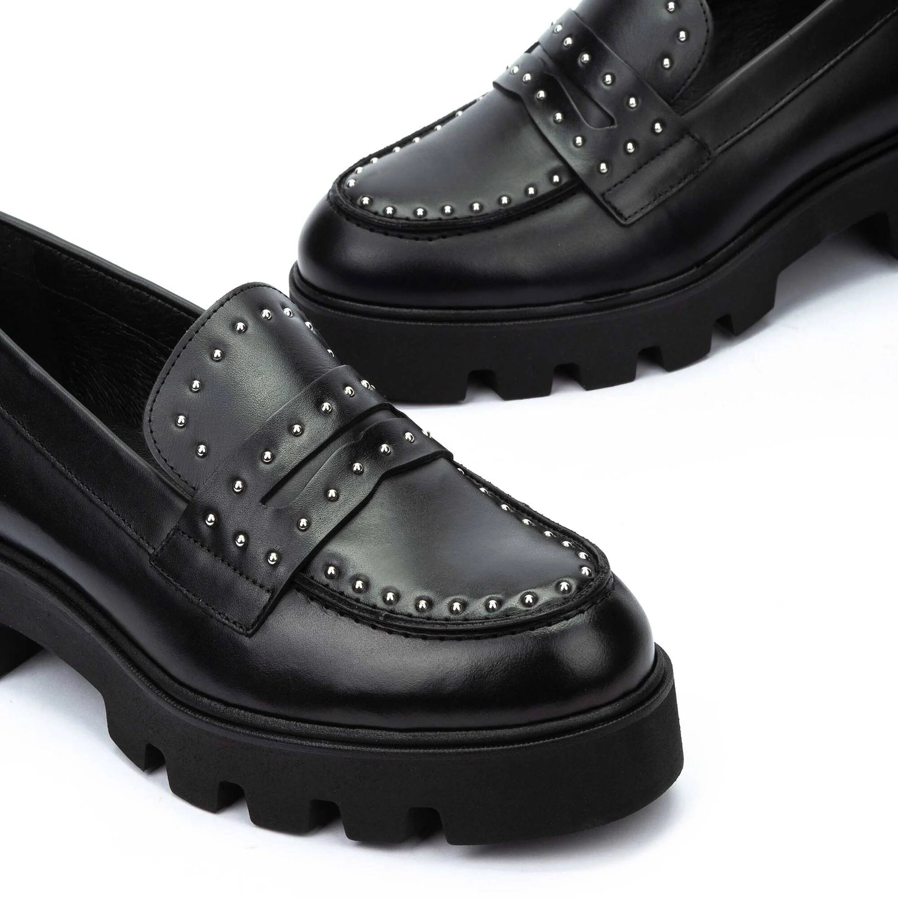 Mocasín Hermosilla. Mocasín de piel con suela track y tachas, tacón plano de 4.5 cm y punta redonda. Exprime el día a día con New Elegance, elegancia actualizada y comodidad.